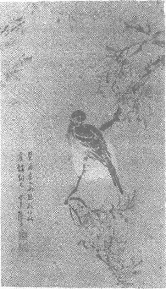 明万历癸酉(公元1573年)。陈嘉言(见《陈嘉言松鹤双兔图轴》条目)绘。纸本设色。纵122.2厘米,横49.2厘米。北京故宫博物院藏。此幅为作者35岁时春天的即景之作。斜入画面的梨树,枝桠条条,梨花簇簇。一只美丽的斑鸠鸟伫立在下倾的茂树枝上,回首梳理着被濛濛春雨淋湿的羽毛,颇为安详惬意。飘浮的云朵在枝上游来荡去,好像舍不得离开皎洁的梨花一样。画左下角“癸酉春日雨窗戏作”的署款,体现了作者作画时的心境。画幅构图疏朗,设色素雅,抒情性强,给人以清心悦目之感,体现了许多明代写意花鸟的基本特征。