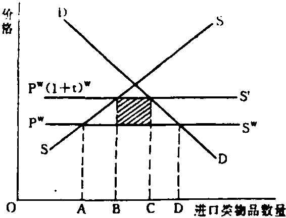 DD与SS分别为国内对于进口类物品的需求与供给表,P w线或S w线代表外国对本国的供给线,P w为进口品的到岸价格。在无关税时,国内价格P d将等于P w,从而OA和AD分别代表国内供给量与进口量。如果施加t w的关税率,使S w移至S t,则国内价格P d也随P w一起上升到P w(1+t) w,从而国内供给升至OB而进口降至BC,阴影部分则代表了关税收入。现在假定不使用关税手段而采用限额措施,那么同样会取得上述限制进口的效果: 将进口限制在BC的数量,则国内供给升至OB,国内价格 P d也升至P w(1+t) w,尽管进口价格P w不变。这时,相当于原阴影面积的部分则是归进口特许证持有者所获之租金。如果此租金收入与在实行关税情况下政府关税收入的花费方式相同,那么限额与关税不仅在实行保护方面具有相同作用,而且它们所产生的福利后果也是相同的。 然而,近20多年来人们逐渐放弃了这种关于限额与关税完全相等的传统观念。伯格瓦蒂 (Bhagwati) 通过将不完全市场的条件引入分析首先对上述理论提出了挑战。他表明,限额与关税的等同仅仅适合于无论国内市场还是国际市场竞争都是完全性的情况,如果市场不完全,例如国内供给者是一个垄断者,那么相对于同样的进口水平,产量在关税情况下将比限额情况下更高,而价格将更低。产生这种情况的基本原因就在于这时由两种政策所引致的供给与需求的移动是有差异的。之后,罗德里吉茨 (Rodriguez) 和多沃尔(Tower) 又在一般均衡的框架内研究了相互报复的问题,表明限额与关税两种政策工具将产生不同的动态过程。 ☚ 关税 关税的消费效应 ☛ 限额quota;limit;norm;ration 参议院通过了一项防务开支法案,对美国在欧洲的军事开支将规定正式的最高~。The Senate approved a defence spending bill which would place (or put) a formal ceiling on US military spending in Europe./在日本和韩国的美国驻军将确定新的最高~。A new cap would be placed on US troop numbers in Japan and Republic of Korea./超过~ exceed the norms (or quota)/达到~reach the full quota/给战略武器确定最高~ establish ceilings on strategic weapons/给中国的~quota for China/分类~ sublimit,subceiling/最高~ ceiling;maximum limit/最低~floor;minimum limit/~表table of limit/~配给rationing/~以上above-norm/~以下below-norm/~支票limited check/~制quota system |