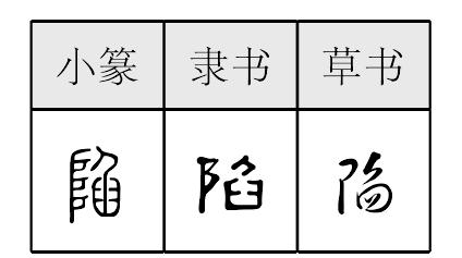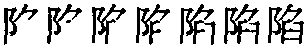【提示】阝 ,2画,起笔是横撇弯钩; 旧字形3画,起笔是横撇。臽,旧字形上从勺或从刀,新字形改为从; 不要错写成从爫的舀。 *陷xiàn10画 阜部 (1) 掉进去: ~落|越~越深。 (2) 凹进去: 凹~|沉~|塌~。 (3) 设计害人: ~害|诬~。 (4) 攻破,占领;被攻被,被占领: 攻~|冲锋~阵|~落|沦~。 (5) 过失;缺点: 缺~。 陷 ☚ 陟 隰 ☛ 陷xiàn甲骨文和金文作臽,小篆、隶楷也有这个字。但少用,常作陷。甲金文象人陷入坑坎形。《说文》说臽是“小阱”。小篆约在秦代作陷,从左耳刀(阜),从臽,臽亦声。隶楷继承。是掉进,坠入或沉下义。如:陷到泥里|地陷下去了。转为名词,指陷阱,坑穴。组词如:陷阱。引申比喻害人的阴谋。又转为动词,指设计害人。如:陷害|诬陷。又指凹进。如:两眼深陷。又有攻破义。如:冲锋陷阵|陷落。 陷★常◎常