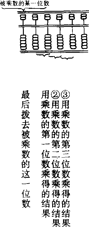 珠算后乘法中的隔位乘,其运算特点是先由被乘数的最低位数与乘数的最高位数相乘, 其结果的个位档与被乘数隔一位 (即两者中间有一个空档)。然后,依次用被乘数的最低位与乘数的第二位、第三位……相乘,所得结果依次向右移一档, 直至将被乘数的这一位乘完, 然后将其拨去, 再对被乘数的倒数第二位施行同样的过程,依次类推。隔位乘的优点是比较好学,不易出错,不需使用顶珠、底珠,与除法中的商除可以互相还原, 缺点是在用乘数与被乘数的某一位相乘完毕后,需专门将这 一位数拨去,增加了拨珠次数。