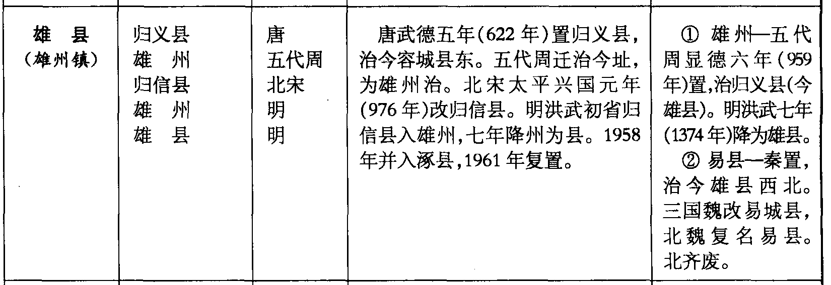 雄县(雄州镇)归义县雄州归信县雄州雄县唐五代周北宋明明唐武德五年(622年)置归义县,治今容城县东。五代周迁治今址,为雄州治。北宋太平兴国元年(976年)改归信县。明洪武初省归信县入雄州,七年降州为县。1958年并入涿县,1961年复置。❶ 雄州—五代周显德六年(959年)置,治归义县(今雄县)。明洪武七年(1374年)降为雄县。❷易县—秦置,治今雄县西北。三国魏改易城县,北魏复名易县。北齐废。