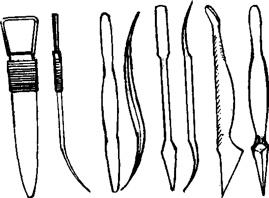 | 释义 | 雕塑刀 雕塑刀雕塑家工作时最好、最方便的工具是自己的双手。用大拇指、食指或手掌。仅此是不够的,还需借助各种雕塑刀。它们实际是手指的延长,辅助手的不足。特别做眼耳及其他细小手指不宜伸至的地方则必用工具。因此雕塑刀形状类似手和手指。这些工具,雕塑家多根据需要自己动手用木、竹、金属等材料制作,造型如图。