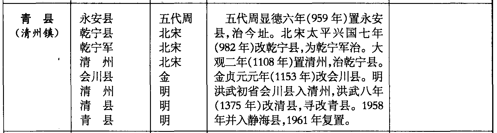 青县(清州镇)永安县乾宁县乾宁军清州会川县清州清县青县五代周北宋北宋北宋金明明明五代周显德六年(959年)置永安县,治今址。北宋太平兴国七年(982年)改乾宁县,为乾宁军治。大观二年(1108年)置清州,治乾宁县。金贞元元年(1153年)改会川县。明洪武初省会川县入清州,洪武八年(1375年)改清县,寻改青县。1958年并入静海县,1961年复置。