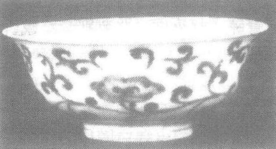明代宫中饮食器具,后为清宫收藏。此碗高5. 9厘米,口径11厘米,足径4.4厘米,系明代永乐时期制品。永乐青花碗有大、小两种,造型亦分撇沿丰腹和敞口瘦腹两类。此件青花灵芝纹碗体小,口沿外撇,腹壁轮廓线直中见曲,近底处弧线内收,圈足。这种碗之式样源于元代墩式碗,而碗的轮廓线的曲度变化柔和自然,更显秀丽,胎薄而轻,犹觉精巧。碗身白中闪青的底釉衬托出艳丽的青花装饰,清新雅洁。主题纹饰展现在碗之外壁,四朵灵芝环绕于腹际。器里,口沿饰卷枝纹一周,碗心的圈线内饰一独放的折枝花。古人认为 “灵芝”是仙草,服之可长生不老,或有起死回生之神效,因其有瑞祥长寿之含义,明清两代常用作瓷品等工艺制品的装饰,常将灵芝与其他纹样相配组成吉祥图案,如以灵芝、山石、蝙蝠、海水等构成“寿山福海图”。单独以灵芝作纹饰的较少见到。此碗的纹饰取用灵芝纹,采取二方连续构图,正面表现灵芝的形象,喻意长寿,主题简洁明了。纹饰流畅,青花匀净,色泽鲜艳,是永乐朝青花瓷器之精品。