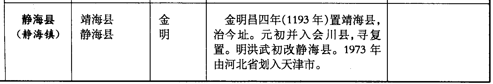 静海县(静海镇)靖海县静海县金明金明昌四年(1193年)置靖海县,治今址。元初并入会川县,寻复置。明洪武初改静海县。1973年由河北省划入天津市。