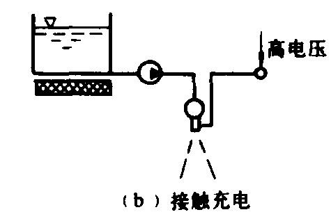 图1 三种充电方法示意图 雾滴充电方法 有电晕充电、接触充电和感应充电等三种(图1)。 电晕充电是在喷头出口雾化区设置一个或多个尖端电极,在通常气压及小输出功率的条件下利用高压电(至少达到空气的绝缘击穿电压,即电场强度为3500伏/毫米以上)及电极尖端的非自持性气体放电,使尖端电极附近形成单极分子电离区,雾滴经过这个电离区时形成带电雾滴。接触充电是高压电(1万伏以上)和即将雾化的药液直接接触,使喷嘴及药液上产生电荷堆积,通过电传导把电荷转移到药液雾流中,使雾滴带电。感应充电是在喷头出口处配置一个感应环,利用静电感应原理,使药滴在经过静电场时,产生感应电荷。要求药液射流末端处在电场强度最大的部位,则静电感应最为显著,药液在雾化过程中受感应而带电。与接触充电相比,在获得同样荷质比的情况下,感应充电所需电压要低得多,大约在3 000伏左右。因此,这种方法有利于保证绝缘。 种类 静电喷雾机有地面喷雾和高空喷雾两种形式。进行地面静电喷雾的主要机具有手持式静电喷雾器、背负式机动静电喷雾机和大型静电喷雾机等,一般均属微量喷雾。高空静电喷雾主要由农用飞机来实现。 手持式静电喷雾器 结构如图2。用干电池或小型蓄电池提供6伏电源,经振荡变压由倍压整流得到1~2万伏的直流高压,用接触充电法使药液在高速转盘雾化过程中形成荷电雾流。