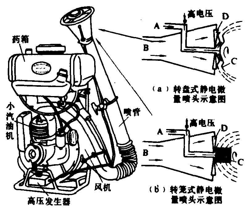 图3 背负式机动静电喷雾机 A.药液; B.高速气流; C.转盘(转笼); D.风轮 背负式机动喷雾机基础上加高压电源,并用接触充电法使转盘式微量喷头[图3(a)]雾化的雾滴荷电。也有用转笼式微量喷头[图3(b)]使药液雾化的。高压电源可用背负机上原有的汽油机照明电提供电源,亦可采用电晕充电法,以加强雾滴荷电量。大型静电喷雾机 主要用于果园喷雾。但带电雾滴易被操作人员吸附,特别在人面对气流方向时更为严重,需采用具有密封驾驶室的拖拉机。 静电喷雾机electrostatic sprayers在静电力辅助下将雾滴喷送到靶标的喷雾机。(见彩图77)
