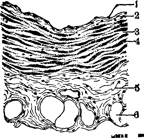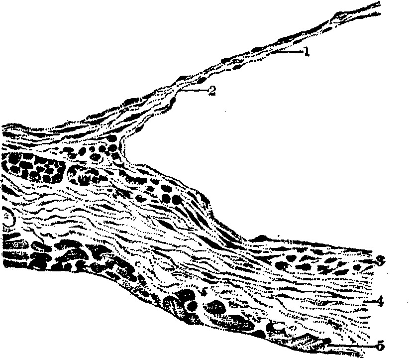 图2 静脉的瓣膜 1.静脉瓣 2.内皮 3.中膜平滑肌 4.外膜5.胶原纤维束 不典型静脉 头静脉、基底静脉、肠系膜静脉、髂静脉、股静脉、腘静脉、隐静脉、子宫静脉和阴茎背静脉的内膜含纵行或环行平滑肌。隐静脉、股静脉和腘静脉中膜内层平滑肌多为纵行; 肾上腺静脉中膜几乎都是纵行平滑肌。肾静脉、门静脉、脾静脉和膈静脉的外膜主要由纵行平滑肌组成。上腔静脉和下腔静脉相当长的一段管壁没有中膜,外膜很厚,含丰富的纵行平滑肌。肺静脉中膜较厚,有纵行平滑肌,弹性组织少。脐静脉中膜有内纵和外环平滑肌。有些静脉平滑肌缺如,故没有中膜,如阴茎的海绵体静脉、胎盘母体部的静脉、脾小梁静脉、皮肤和甲床的小静脉、硬膜静脉窦、脑膜和脑的静脉、视网膜静脉和骨的静脉等。大静脉(如腔静脉、颈静脉、无名静脉和锁骨下静脉)的中膜含胶原纤维和较多的弹性组织,弹性组织多是不完整的膜,与平滑肌更迭配布。精索的蔓状静脉丛壁厚,富有结缔组织和平滑肌,弹性组织少,中膜与外膜无明显分界。腔静脉和肺静脉近心脏的一段,外膜中有环行心肌纤维,这些血管通入心脏处有少量纵行心肌纤维。 ☚ 动脉 毛细血管 ☛ 静脉vein |
