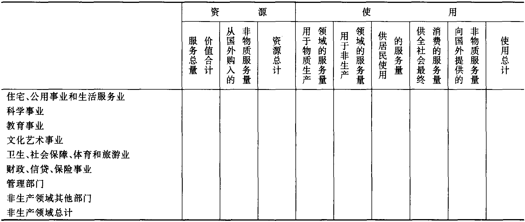 | 释义 | 非物质服务平衡表Balance of NonMaterial Services原经互会的国民经济平衡表体系中的主要平衡表之一,通过价值形式反映一定时期一个国家非生产领域的情况。非物质服务包括为满足社会成员文化和生活需要以及为全社会服务的各类活动。表式: 非物质服务资源和使用平衡简表