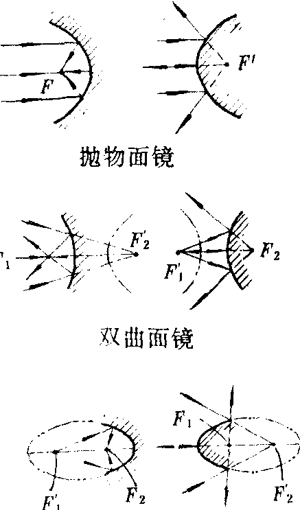 镜面既非平面又非球面的反射镜。其中抛物面镜、双曲面镜和椭球面镜使用得最多。它们的反射面分别由抛物线、双曲线和椭圆绕主轴转动形成。也可以分成凸、凹两种镜,凸镜为发散镜,凹镜为会聚镜(见图1)。
