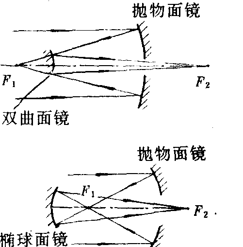 抛物面镜有一个焦点,它的主要特性是使平行主轴的光束反射后会聚于焦点(或反向延长线交于虚焦点);位于焦点的发光点发出的光束,经反射后成平行光束。常用作天文望远镜的物镜和探照灯的反射面。双曲面镜和椭球面镜都有两个焦点,其成像特性是:放在一个焦点上的发光点必成像于另一焦点。可用做天文望远镜的物镜,让远处天体发出的平行光,先经抛物面镜会聚于椭球面镜或双曲面镜的一个焦点,再于另一焦点处成像(见图2)。以上三种反射镜的优点是凡成在焦点上的像皆无球差。