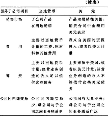 | 释义 | 功能性货币 功能性货币是跨国公司子公司在其所处的经济环境中创造和支用现金的货币。 功能性货币是美国财务会计准则委员会第52号声明首次提出,与报表货币区分开来的。一般说来,功能性货币的选择有三种情况,如果子公司在当地国家中相对的“自给自足”,业务基本上限于当地国家之内,则功能性货币即为当地货币。 例如英国子公司在当地生产和销售其大部分产品,那么其功能性货币是英镑。 另一种情况是,子公司的业务是整个公司的有机组成部分,是公司业务的扩展和延伸,那么功能性货币是美元。例如,香港装配工厂从美国母公司运进零部件加以组装,然后将成品销往美国。第三种情况,功能性货币既不是当地货币,也不是美元,而是第三国货币。尽管各个公司在选择功能性货币时有相当大的自主权,但必须说明的是,在高度通货膨胀(3年之内通货膨胀累计接近100%)的国家里,功能性货币必须是美元。除此之外,大多数子公司都习惯于用当地货币作为功能性货币。 表4-7-1 功能性货币决定条件表