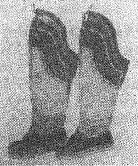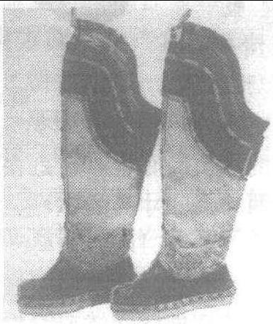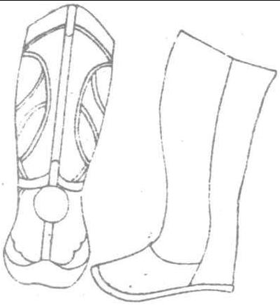 清康熙绣钩藤绢米珠朝靴 ☚ 屝 鞜 ☛ 靴 靴为长筒鞋,用皮革制成,原是中国北方游牧民族所穿,便于乘骑跋涉水草。自战国赵武灵王胡服骑射,靴才开始进入中原地区,不过当时汉族穿靴主要是作为戎装,平常一般人很少穿。南北朝时期,由于北方游牧民族进居中原,靴更为流行。虽然南朝人多喜穿靴,但仍只是作为私服穿用,不作为正式的服饰。北朝人除平时穿用外,朝会之间也以靴作为足衣。南朝短靿靴流行,一般靴而外,还有织成靴、虎皮靴等等名目。穿靴上殿,在南朝是有失恭敬的。唐代胡服盛行,穿靴成为一时的风尚。皇帝以靴作为骑马时的服饰,官员也以靴作为常服的服饰。唐代官员的常服流行六合靴,以六块皮革缝制而成。文武官员和普通百姓都喜穿短靿靴,内衬毡里。靴的式样繁多,有高统、短靿、绵、丝等名目和面料; 又有尖头、圆头、高头、平头种种式样。这时的靴已成为官场中的正式服饰,可以穿靴入朝奏事。《唐书·李白传》记载,大诗人李白曾多次陪唐玄宗喝酒,醉后命高力士脱靴,这即是穿靴入禁中的例证。宋代更流行穿靴,官员朝会时必须穿靴。靴的形制参用了汉族履的制作方法,用黑革制成,高八寸,颜色随官服确定。一般士大夫则喜穿乌皮靴,陆游就有“归来脱靴靴满霜”的诗句。唐宋贵妇也喜穿靴,宫女、歌舞者更为喜尚。唐代流行红色锦靴,宋代红靴时髦。靴靿以织锦制作。歌舞伎也常穿靴跳胡舞。明清两代靴成为文武官员的专用服饰,一般人禁止穿用,所以靴又被称作“朝靴”。朝靴的靴底前呈方形,后呈圆形,以象征“天圆地方”,因此又称作“朝方靴”。用青缎制成,生牛皮为底。一般靴的质料春秋用缎,冬季用建绒,守丧者用布。平时官员多穿夹头靴。《京师竹枝词》云“尖靴武备院称魁”,说的是武备院尖头靴的式样最好。清嘉庆(1796—1820)以后还有一种绿尖缝靴,是军机大臣的专用靴。公差和下级士兵多穿一种薄底快靴,名“爬山虎”,轻便利步。靴底开始非常厚,因太笨拙,改以通草为底,叫“军机跑”,取其行走轻便。
