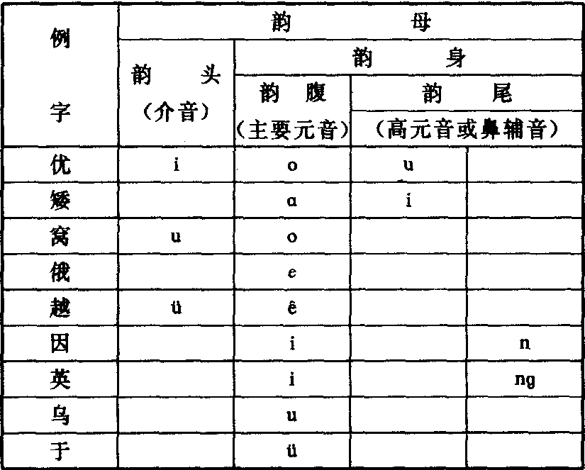 ☚ 半元音 辅音 ☛ 韵母 韵母yunmu简称“韵”。注音字母称“韵符”。汉语传统音韵学术语。 ☚ 声母 声调 ☛ 韵母 韵母Yunmu音韵学术语。指一个汉字的音节除声母以外的其余的音素。含一个元音的韵母如 (de的),含两个元音的韵母如ei (fei飞),含三个元音的韵母如iao (xiao肖); 由元音辅音结合而成的韵母如ian (qian前)、iangxiang相。 ☚ 声母 介音 ☛ 韵母 韵母韵母是汉语音节中声母后面的部分。韵母内部又分为韵头、韵腹、韵尾三部分。例如liang(良)的韵母是iang,其中的韵头是i,韵腹是a,韵尾是ng。韵腹是韵母的主要元音。韵头是韵腹前面的元音,又叫介音,由高元音i、u、u充当。韵尾是韵腹后面的音素,又叫尾音,元音韵尾由i、u(o)充当,辅音韵尾由n、ng充当。在韵母中,韵腹是必不可少的,韵头、韵腹都是可有可无的。韵母按内部结构可分为单韵母、复韵母和鼻韵母三类。现行教材中的单韵母有a、o、e、i、u、u,其中e代表e、e两个,e出现在ie、ue两个韵母中。i代表i、 i〔 ☚ 声母 声调 ☛ 韵母音韵学术语。指一个汉字音节除声母以外的其余的音素。一般由韵头、韵腹、韵尾3部分组成,但并非每一个韵母都具备这3种成分。元音是构成韵母的主要音素。 韵母 韵母一个汉字音节中除声母以外的音素。普通话中韵母有39个。其构成: ☚ 辅音 声母 ☛ 韵母五卷。明吕维祺撰。《音韵日月灯》之一。吕氏生平见“音韵日月灯”。吕氏谓字者孳乳增多者也。母之生子必本其父。父一而已,母有七,宫商舌牙之类是也。母有三十六,见溪之类是也。有开有合,分其族氏。有清有浊,辨其世类。有开收之等,以析伯仲。有点画反切,以核形体姓名。有“众”“独”之音,以分子姓世系。基于以上认识遂撰《韵母》一书。该书相当于韵图。它按照等韵学理,以声调为纲,统辖一百零六韵,将韵目标于书眉,注明开合呼及字数,纵列各声纽之字。各纽注以字母及等第,如见一、见三等,下列同小韵之字,顺序排列。字母之旁注明反切,各字之旁标明“众”、“独”、“补”。吕氏云:“ ‘众’ 者,一字数音者; ‘独’ 者,独音也;其未查明者则缺之; 间有‘补’ 字,乃沈韵原无而今补出者。”这部书对诗韵及《四声等子》等的分韵定呼,作了某些订正。吕氏云:“沈韵 (案指诗韵) 既失音等,复混开合,今依《等子》《经世》等书正之。然《等子》亦有讹者,如平声之侵覃盐咸、上声之寝感琰豏、去声之沁勘艳陷、入声之缉合叶洽,本呼如山开摄,而《等子》深咸二摄皆作合摄,以《正韵》《中原雅音》考之,俱宜改作开摄,袁子肩亦有宜作开摄之说。”认为《等子》定侵覃等闭口韵为合摄是“讹”,它们本呼如山开摄,这是吕氏根据后代 〔-m〕 尾变为 〔-n〕 尾的事实,否认它们本读为闭口 (合摄),反诬《等子》讹误,说明吕氏对古今音变的认识是肤浅的。吕氏谓 “声音以 《正韵》为主,《正韵》主中原雅音”,因此《日月灯》三书所表现的基本属中原雅音。《韵母》的列字,大体折衷于诗韵与《正韵》之间。分等仍如《等子》的四等,不过它把一、二、三、四等称为开、发、收、闭,其分等主要从声类着眼,称谓仿效邵雍。在《同文铎》所附《图说》中,吕氏附《等子》四图,作为图说的例子,说明旧等韵对吕氏有重要影响。吕氏说:“盖以七音生切,切生字,字复生字,生生不穷,故曰韵母。”所以这部书称为《韵母》。《音韵日月灯》有明崇祯六年 (1633年) 刊本。 韵母 韵母阜阳话韵母共37个,见表9-3-1。 表 9-3-1 阜阳话韵母