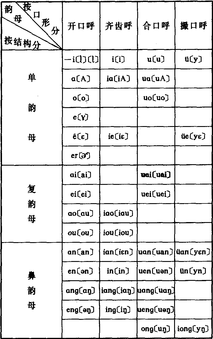 汉语普通话的韵母共有39个。按韵母结构分,可分为单韵母、复韵母和鼻韵母三类(参见普通话韵母表)。单韵母是由单元音构成的韵母,又叫单元音韵母。如a、o、e、i、u、u。复韵母是由复合元音构成的韵母,又叫复元音韵母,如ai、ei、ao、ou、uai、uei等。鼻韵母是以鼻辅音收尾的韵母,又叫鼻音尾韵母,如an、en、uan、uen、ang、eng、iang、ueng等。按开头元音发音的口形,可以分为开口呼、齐齿呼、合口呼、撮日呼,简称四呼(参见普通话韵母表)。开口呼是不以i、u、u作韵腹或韵头的韵母,如a、o、e、an、en等;齐齿呼是i或以i作韵头的韵母;合口呼是u或以u作韵头的韵母;撮口呼是u或以u作韵头的韵母。iong[y ]是撮口呼。普通话韵母表