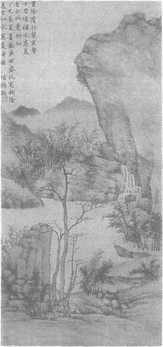 明。项德新绘。纸本水墨。纵57.2厘米,横27.1厘米。北京故宫博物院藏。项德新(约公元1563—?年),字复初,明画家项元汴之子。工山水,得荆(浩)关(同)法,尤善写生。传世作品有《绝壑秋林图轴》、《乔岳丹霞图轴》、《仿王孟端竹石图轴》等。这幅图以湿润苍秀的笔墨成功地晕染了一幅意境迷离的山林景致:远岫平缓,近崖崔嵬,雾气沼沼,山泉跌荡。秀竹轻挺摇曳,沿岸伸向远方。溪边斜坡上,新篁簇簇,芳草稀疏。陡立的壁石旁,两株嘉树参天耸立。图的左上角有题署“垂阴覆林麓,寒声下碧墟,绣衣高盖者,于此意何如。丁巳长夏暑盛,在西斋北窗,桐阴绕坐如水,写是寄傲,项德新。”下钤白文<德新之印>。