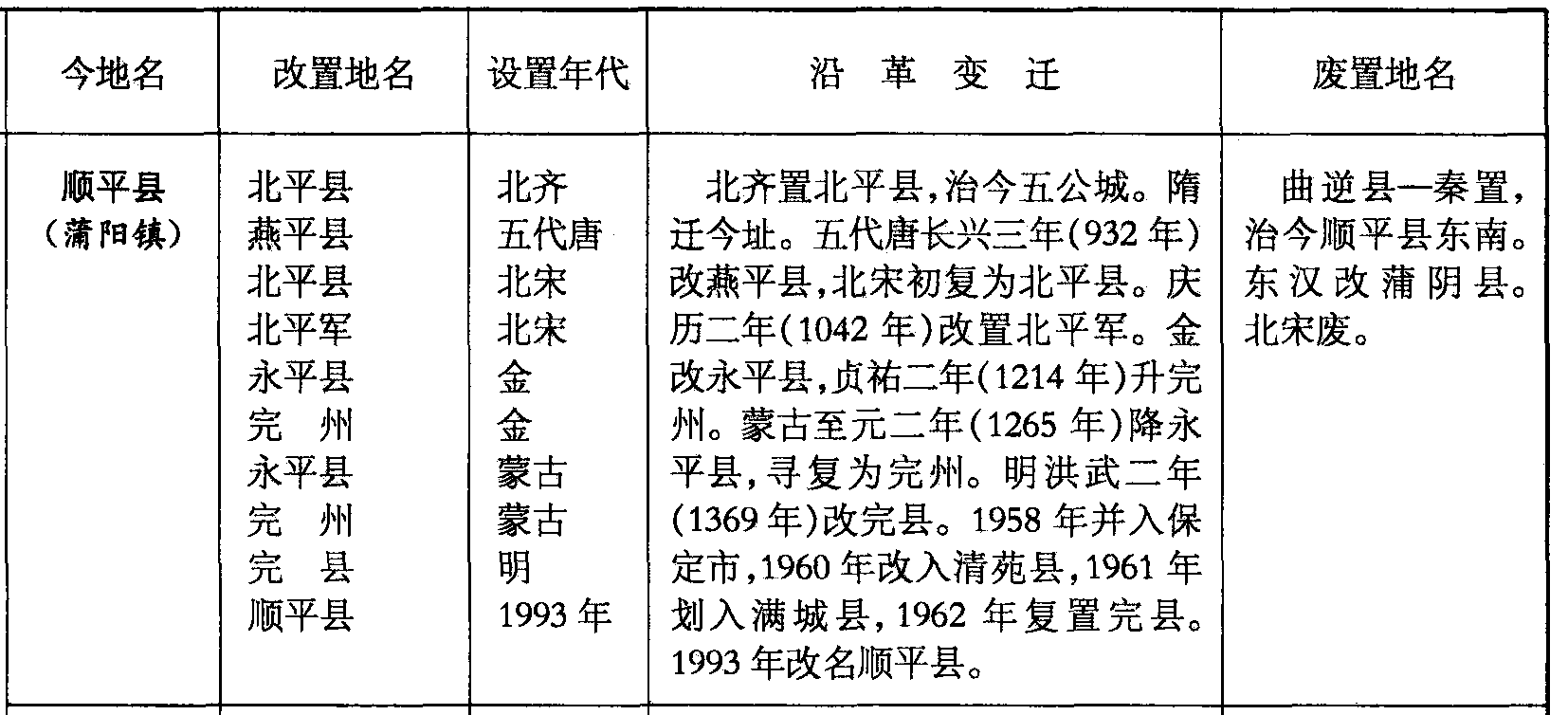 顺平县(蒲阳镇)北平县燕平县北平县北平军永平县完州永平县完州完县顺平县北齐五代唐北宋北宋金金蒙古蒙古明1993年北齐置北平县,治今五公城。隋迁今址。五代唐长兴三年(932年)改燕平县,北宋初复为北平县。庆历二年(1042年)改置北平军。金改永平县,贞祐二年(1214年)升完州。蒙古至元二年(1265年)降永平县,寻复为完州。明洪武二年(1369年)改完县。1958年并入保定市,1960年改入清苑县,1961年划入满城县,1962年复置完县。1993年改名顺平县。曲逆县—秦置,治今顺平县东南。东汉改蒲阴县。北宋废。