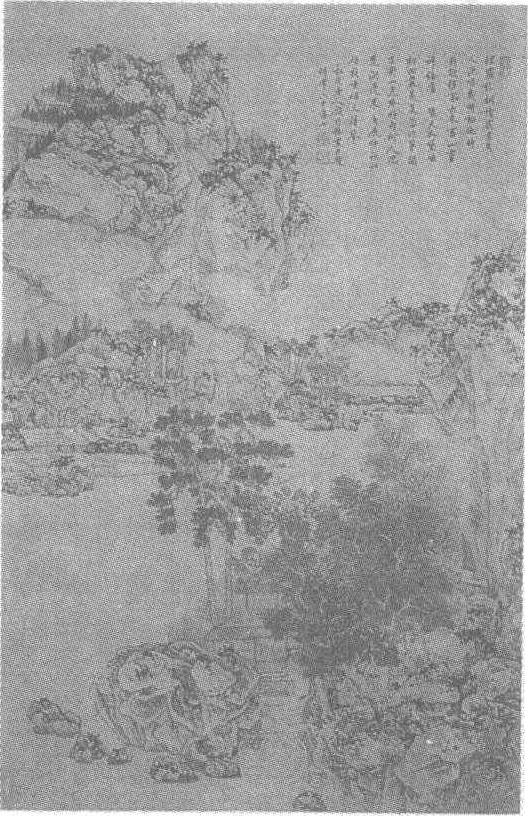 清。顾符稹绘。纸本设色。纵121.5厘米,横7 9.8厘米。北京故宫博物院藏。顾符稹(公元1635年—?),一作符祯,字瑟如,一字松巢,号小痴,江苏兴化人。能诗善画,山水人物学唐代著名山水画家李昭道,工细入毫发。贫困时以卖画自给,故临摹古画很多。工书法。卒年不详。康熙五十五年(公元1716年)顾氏83岁还尚在。此图画远山高耸,峰峦层叠,悬崖峭壁,山顶平坡处,林木苍郁,掩映寺院一座,山腰间云雾弥漫,泉流一波三折跌入山下湖中。山下,田畦如网,农夫耕忙,湖中舟楫穿梭捕鱼繁忙,远桥飞架,村落隐见。近处山崖下的小径上走来挑夫、行旅,绿松高拔劲硬,丛菊、芙蓉花盛开,在树荫掩映下,房屋楼舍隐现,里面有文人持卷读书,湖边还有一侍童正准备汲水,颇有山野生活的情趣。设色淡雅,清丽秀逸,用笔严谨工细,画风清旷潇洒,山石用线勾出轮廓,再用浓墨提醒。右上自题七绝二首,署款“庚辰仲秋,松崖老人顾符稹画并题,时年六十又七。”钤<顾符稹>等二印。庚辰为清康熙三十九年(公元1700年)。