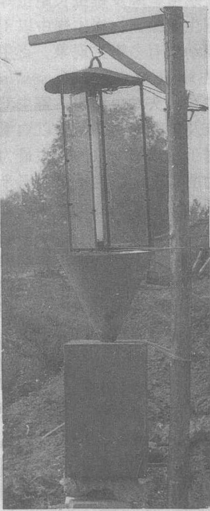 预测诱虫灯的光源,规定采用200瓦的白炽灯,或20瓦、36.5纳米的黑光灯。装置白炽灯的标准如下: 雨罩直径0.83米,漏斗直径0.5米,高0.25米,雨罩口与漏斗口之间距离0.17米。黑光灯的规格是: 灯管长604毫米,直径38毫米。灯管四周各竖玻璃挡板一块,使飞来的昆虫经碰撞而落入漏斗,此玻璃挡板规格为3×154×600毫米,灯管竖放,其上有一直径为420毫米的防雨罩,灯管下方有一直径为400毫米的漏斗(见图)。以上两种漏斗的下口均接毒瓶,以便收集昆虫。两种灯都以漏斗口距地面1.7米为标准高度。设灯地点以四周无房屋、树木等障碍物、附近无路灯及其他灯光为宜。 |