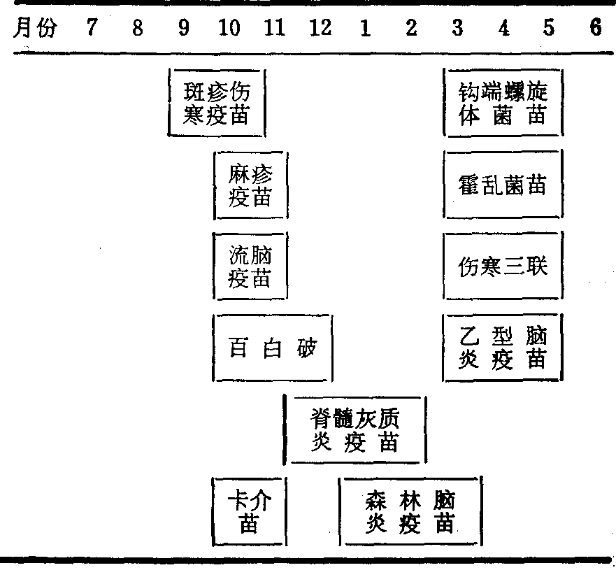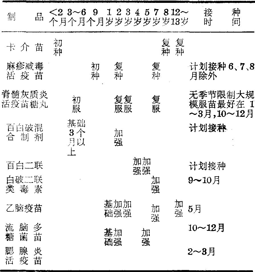 * 在乙型脑炎流行区可增加乙型脑炎疫苗 此表根据卫生部(80)卫防字第3号文件“预防接种实施办法”整理 婴幼儿及少年儿童是预防接种的主要对象。6个月以上的婴儿从母体获得的抗体已逐渐消失,对多种传染病都是易感的,为了达到保护的目的,必须在短时期内接种多种制品。对婴幼儿和少年儿童应由常年接种点根据适当免疫程序做好重点病的基础免疫。 对特定人群,根据需要开展预防接种,如从事毛皮畜牧、乳、肉等工作的人群,需要接种布鲁菌活菌苗、炭疽活菌苗。对饮食服务行业人员需要接种伤寒、副伤寒甲乙三联菌苗。 无论是经常性预防接种或集中式预防接种,均应根据生物制品的免疫特性及传染病的流行特征,合理安排接种时间。一般应在流行季节前1~2个月内完成。应当使免疫力最强的时间正好在历年发病最多的时间。但应注意在流行性乙型脑炎和脊髓灰质炎流行期间不应接种百日咳菌苗,特别是在有流行的单位更应注意,以免促进儿童感染乙型脑炎和脊髓灰质炎或诱发潜在感染。合适的接种时间见表2。 当有外来性传染病的袭入,或某传染病发生爆发或流行时,对广大易感者采取紧急的预防接种,称“应急接种”(计划外接种)。 对预防接种工作要进行监督检查,包括预防接种计划,免疫制品,接种技术,是否保证全程足量,是否有漏种,重种,接种率是否达到要求,接种卡片登记是否完整,保管是否妥善等。 预防接种的禁忌证 预防接种的不良反应,特别是异常反应,很大部分是由于接种对象的反应性不正常,或处于某种病理状态而发生的。为避免接种后发生异常反应,各种制品都规定有禁忌证。一般禁忌证,适用于多种制品;特异禁忌证,只适用于某种制品。任何禁忌证掌握不严,均有发生异常反应的危险。但发生概率多少及反应的严重性如何,则随制品种类和禁忌证的性质而不同。一般说来,忽视特异禁忌证比忽视一般禁忌证更危险。 表2 主要制品年度预防接种安排参考