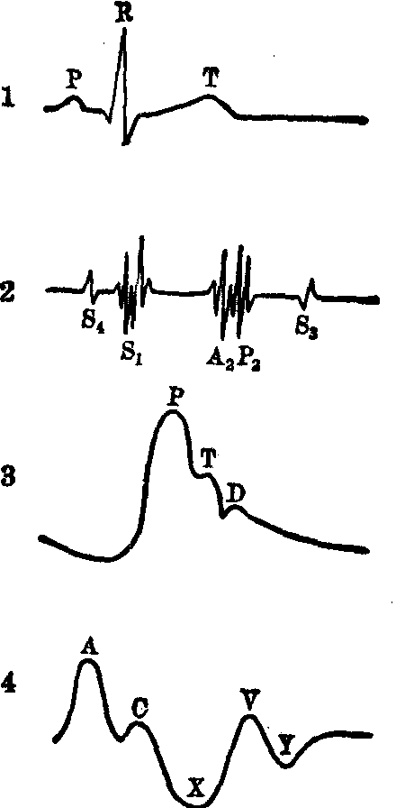1.正常心电图 2.心音图3.颈动脉搏动图 4.颈静脉搏动图 (改自Warta-ke 1972)