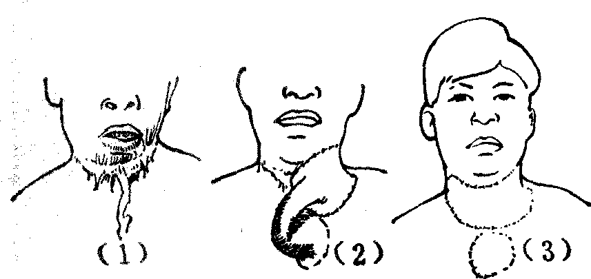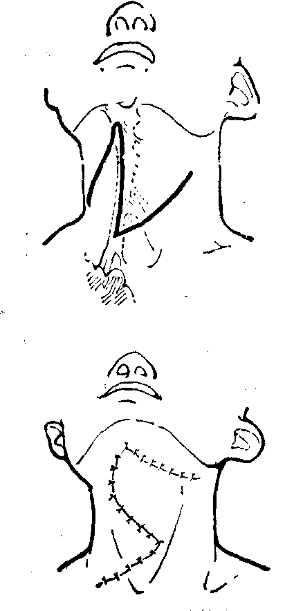 图1 颈部重度瘢痕挛缩所致颏胸粘连 (3)中度: 介于轻度与重度之间的程度不等的挛缩。常由颈部的增生瘢痕所致,瘢痕面积较大,但仍限于颈部。颏部多亦受波及,形成较颏胸粘连为轻的颏颈粘连,致颏颈角消失。仰头时可能出现下唇轻度外翻,和瘢痕对口角、鼻翼、耳垂、下睑等的轻微牵扯,但低头时即均基本恢复常态。头部后仰和转动较受限制。 手术治疗应俟瘢痕稳定已趋软化基底松动后施行。术前准备,应加强口腔卫生保洁,瘢痕表面如有溃疡,也须给予适当处置。 手术要点是: ❶保证手术过程中呼吸道的畅通; ❷彻底松解挛缩; ❸妥善修复创面。 为保证呼吸道畅通无阻,应在经鼻清醒气管内插管麻醉下进行手术。否则,在麻醉诱导过程中,一旦发生喉痉挛或呼吸道梗阻时,因受体位限制,气管切开术或其他紧急抢救措施均难施行。如在术中发生,则临时再行气管内插管,操作不便,且不免招致创口污染。故严重挛缩,虽然头部不能后仰,多只能采用盲插法,难度较大,但亦必须进行。经口插管,在张口状态下不利于挛缩的彻底松解,应经鼻插入。如插管经反复试探确有困难时,可考虑在局部浸润麻醉下,先在颈部挛缩的最紧张部位作一条或几条横向切口,以使头部后仰,降低插管的难度。静脉麻醉法有防止术后呕吐污染创口,以及复苏快等优点,最宜于采用。 为便于彻底松解挛缩,术时应将两肩垫高,以便随挛缩的松解头部有得以充分后仰的余地。挛缩的松解必须彻底,颈阔肌较浅、多亦因烧伤而发生挛缩,也须切除。如为轻、中度挛缩,可将瘢痕完全切除,其与胸腋颌面瘢痕相连的重度挛缩,则切除范围多以能达到充分的松解为限,位在颈侧的创缘应切成锯齿状。术中能否显露出正常深度的颏颈角,可作为检查松解是否彻底的可靠标志。 修复创面应根据创面大小,邻近及周身供皮条件等选择皮片、皮瓣或皮管移植法。 中厚或全厚皮片移植术最常采用,如为包括颌面和胸腋部的重度挛缩,则常是惟一可行的方法。术时应将所植皮片围绕甲状软骨四周行绷线缝合,以保持较好的固定,避免因吞咽活动妨碍该部皮片存活。皮片法的优点是操作简便易行。缺点是因在日常生活和工作中,头部多处于俯首位,因而助长了皮片存活后的皱缩。故术后必须及时采取有力防范措施,以维护稳定的疗效。 皮瓣移植术的皮瓣,多取自颈部及其邻接的前上胸壁。该部皮肤富于弹性,伸展性强,皮下组织较薄,松动,血运好,适于施行局部皮瓣手术。如为轻度的蹼状瘢痕挛缩,宜采用单一或连串Z成形术(图2)。如为轻、中度挛缩,应将颈部残留的正常皮肤,或前上胸壁的皮肤充分加以利用,形成局部皮瓣,旋转推进移转后,用以修复全部创面,或一部分创面,重点是甲状软骨前方部位的创面,其不足部分以皮片移植补充。局部皮瓣的供皮区偶可于行广泛的皮下潜行剥离后缝合,多需移植皮片(图3 )。此法操作虽较单纯皮片移植修复复杂,但术后皮肤色泽好,厚度适宜,外形佳,疗效稳定。此外,还有游离皮瓣法,可以不受局部供皮条件的限制。但应注意选择皮下脂肪层较薄的供皮部位,以免外形臃肿,致使颏颈角不甚显著。
