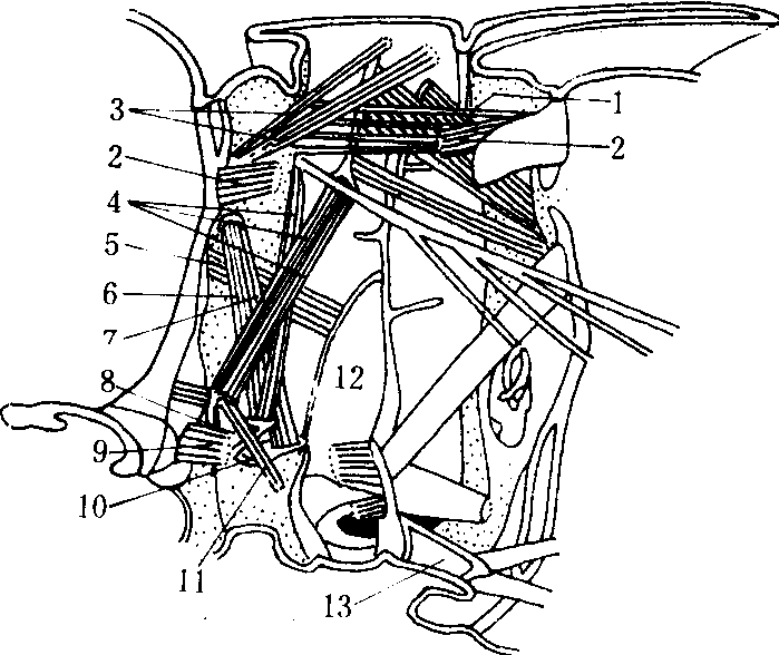 颈膜cervacoria昆虫头部和胸部之间狭窄的膜质部分。前端起于后头孔,后端连接前胸,侧面具一对相互关联的侧颈片。其中前侧颈片与后头突关联,后侧颈片与前胸的前侧片形成关节。两侧颈片上分别着生有起源于头颅内壁和前胸背板上的肌肉,两侧肌肉交叉排列,控制头部伸缩。 |