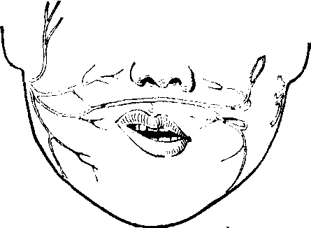 图1 颜面神经麻痹(左侧) 治疗,中枢性麻痹应针对病因,周围性麻痹应根据病程的早晚采取相应的措施。 周围性麻痹的早期治疗,目的在于设法恢复神经功能,方法包括针灸、减压术、神经吻合术、神经移植或神经交叉吻合术和神经搭桥术等。针灸疗法可用于能排除中枢性病因确诊为Bell面瘫的病例,并配合应用扩张血管、消肿和营养神经的药物,以及物理治疗等措施。减压术——面神经管下段减压术,可考虑用于Bell面瘫发病在两个月以内,急性期已过仍未见明显好转病例。神经吻合术,当面神经因外伤或手术误伤切断时施行。如有神经缺损,在条件适宜的情况下,可行神经移植连接。如条件不足,可牵引神经断端暂与邻近组织缝合固定,以防回缩。并作好明显标志,积极创造条件,争取及早行神经移植修复术。神经交叉吻合术,当面神经近侧端,因创伤、感染或瘢痕等原因已无法寻觅,而表情肌尚未显著萎缩时,可以考虑采用。即将舌下神经、舌咽神经、副神经或膈神经切断,以其近侧断端与面神经的远侧端相吻合,代替面神经中枢的功能。惟此种手术系转借其他中枢神经的冲动以引起面部表情肌的收缩,故甚难期望能产生对称协调而自然的表情活动。面神经搭桥术,为取1~2股腓肠神经,横跨过上唇皮下组织吻合于健侧的颊支和患侧的面神经末梢支之间的手术方法(图2)。