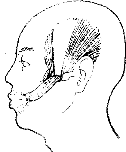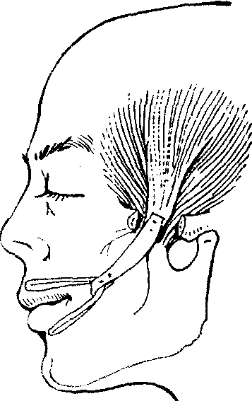 图4 筋膜条悬吊术 动力支持法,利用肌肉的移转或移植,不仅能达到在静止状态下的平衡,并能恢复一定的自主表情能力。有肌瓣、肌瓣-筋膜条、骨骼肌等的移转和移植等手术方法。 肌瓣移转术,是以自非由面神经支配的嚼肌或颞肌分出的几束肌瓣,分别直接移转到口角和上下眼睑的手术方法(图5)。不仅赖以保持两侧肌力的均衡,并可替代瘫痪的面肌行使运动功能,还可能有改善瘫痪肌肉神经营养状态的作用。术中须注意保存支配肌瓣的神经血管的完好,且缝合固定时不可使肌肉处于过度紧张状态,以免影响血运而引起肌组织的退行性变。术后须靠咀嚼活动表达感情,故形态不甚自然。