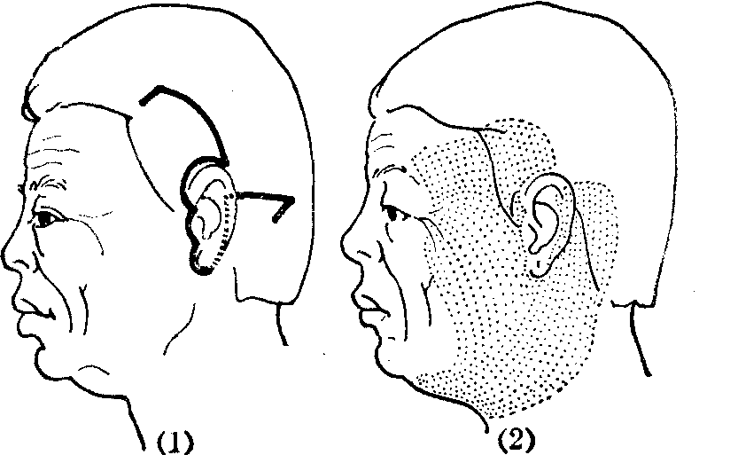 (1)切口; (2)皮下潜行剥离范围。