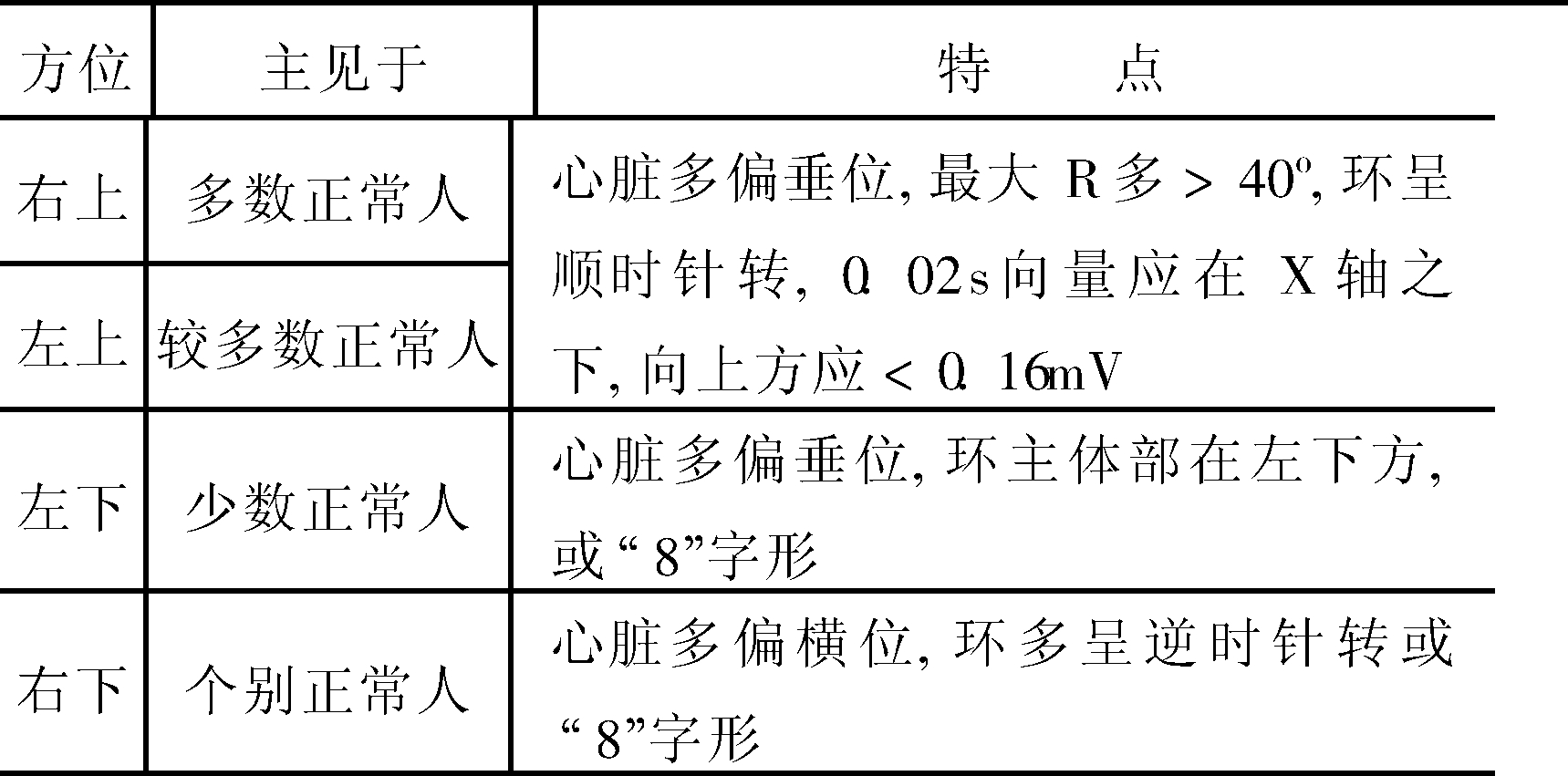 | 释义 | 额面QRS向量环 额面QRS向量环frontal plane QRS vector loop指QRS空间的向量环(QRSSE)在额面上的投影。额面QRS向量环近似椭圆形或狭长形,环体多位于左下方,在第Ⅰ象限,最大向量在0o~+85o之间(+40o左右)。环的运转方向变化不定,约65%呈顺钟向运转,28%呈“8”字形运转,7%呈逆钟向运转。当环的方位接近垂直时,多呈顺钟向运转,只有少数向左的横位环可呈逆钟向运转,QRS向量环位于导联的某一侧,就决定了该电压的正负向。初始向量多在右上方,因其运转方向多变,故终末向量分布范围也较大。其额面QRS环起始向量及最大QRS向量的方位鉴别要点见下表。 额面QRS环起始向量鉴别要点 额面最大QRS向量的方位