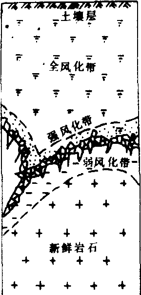 | 释义 | 风化壳weathering crust地壳表层岩经风化作用形成的松散残积物堆积层。风化壳的化学和矿物成分、形态和厚度随气候条件而异。在不同气候带,不同水热条件下形成的风化壳的地球化学类型有:碎屑型、碳酸盐型、硅铝型、富铝型、氯化物—硫酸盐型等。风化壳的表面因生物活动积累了较多有机物质,发育成土壤。因此,风化壳是形成土壤的母质,其物质成分影响着土壤的类型和性状。 风化壳 风化壳fenghuaqiao岩石经受风化作用后,仍残留覆盖在原来母岩之上的风化产物称为风化壳或残积物。风化壳的厚度不一,从几十厘米到几百米不等,其主要取决于气候、岩性、构造、地貌和发育时间等因素,一般说来,在气候湿热、植被覆盖较好的平坦地区,断裂较发育的地区风化壳的厚度更大。风化壳的结构从上到下可以划分为: 土壤层、风化土层 (全风化带)、风化碎石带 (强风化带)、风化块石带 (弱风化带)、风化裂隙带(微风化带)及未风化的岩层(如图所示)。一个发育完全的风化壳在垂直剖面上有明显的分带性。根据其发育过程可分以下几种类型: