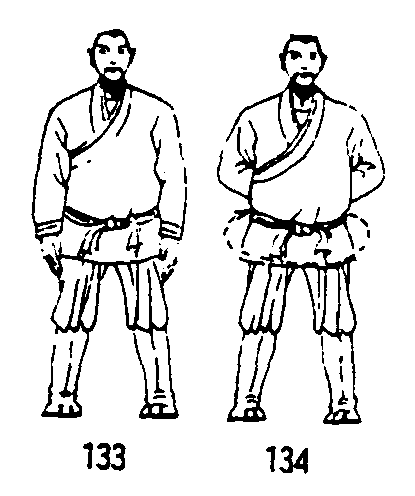 四十九式经络动功第3段“导气”动作之八(全套动作顺序第三十式):两手慢慢推按鹤顶穴将身体直起,两掌垂于体侧;眼平视前方。(图133)不停,两掌沿脊柱两侧向上摩运至肾俞附近,先做顺时针方向旋腰3周,再做逆时针方向的旋腰3周。(图134)要求:精神集中,意守命门;呼吸自然;腰部旋转幅度宜大,两腿伸直,两掌依次推动腰部,上体允许有适度的前俯后仰,但头部的投影一直在两脚之间。整个人体就像阵阵微风吹拂着的荷花,飘摇飞舞,轻松自如。