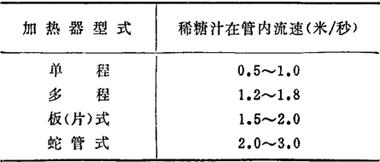 浓糖汁在管中的流速较表中提供的数据为低,如在多程式加热器中可选0.5~1.0米/秒。