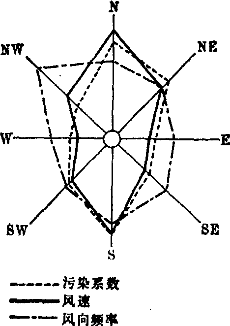 风速玫瑰图 风速指单位时间内风走过的水平距离,以m/s表示。其绘制方法同上。所不同的是各方向上分别以平均风速画点,圆心内数字为总平均风速(图2)。 风速越大,则下风方向受污染的范围也越大,但污染程度也越少,即污染程度与风速成反比。如图2所示,该地西北方向的风速最大,东、西两方向的风速最小。 污染系数玫瑰图 是将每个方向的风向频率(%)用该方位的平均风速(m/s)来除,可得出一个综合性指标即污染系数(见表)。此污染系数也可绘成污染系数玫瑰图(图3)。