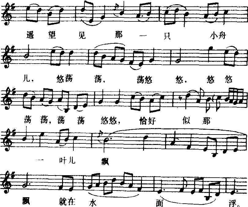 京韵大鼓的一支精致优美而有表现力的小段。著名老艺人良小楼、骆玉笙,都各有自己独到的设计与发挥。它是一个写景的抒情小品。其唱词秀丽典雅,押“由求”辙,长短句似随意写来,无拘无束而自成纹理。唱腔细腻传神,舒展绵长,起伏跌宕,韵味清新。京韵大鼓音域宽达两个8度以上,婉转的拖腔,尤其令人回味无穷。例如,当曲中唱到“遥望见那一只小舟儿,悠荡荡,荡悠悠,悠悠荡荡,荡荡悠悠,恰好似那一叶儿飘飘就在水面浮”时,经过加垛扩充的长句,以低回绵长的音乐,编织了一幅精美的画卷。