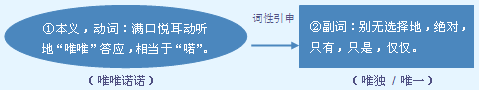 wéi 拟声模拟应答的声音。唯唯连声|唯唯诺诺 唯 2 wéi 副表示限定范围,相当于“单单” “只”。用法说明㊀“唯”字统读 wéi,不读 wěi。㊁“唯2”原来只用于“唯物论” “唯心论” “任人唯贤”等少数词语,现在由“惟2”组成的词语一般都写作“唯”,如“唯利是图” “唯命是从” “唯一” “唯独” “唯有” “唯恐”等。