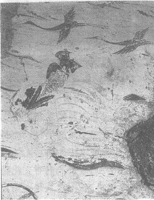 北魏。甘肃省天水市麦积山石窟第154窟顶部壁画。此图的飞天虽已模糊不清,但其美丽的轮廊依然可辨黑发梳成漂亮的高髻,脸的轮廊清秀典雅。身体着长裙,飞舞的姿态优美动人。所有这些均根据残存的印迹看出。这隐约可现的形体为人们展现了充分的想象空间。飞天的头顶上部有振翅高飞的双鹤,尖喙长长的外出,长颈及身体显现出柔和优雅的弧度,后展的双腿匀细而有力度。作者充分把握了双鹤高速飞翔时身体轮廓的勾画,运笔果断、熟练,通过简单的笔画将双鹤的神似表现了出来,与下部的飞天相配,真是如入仙境。