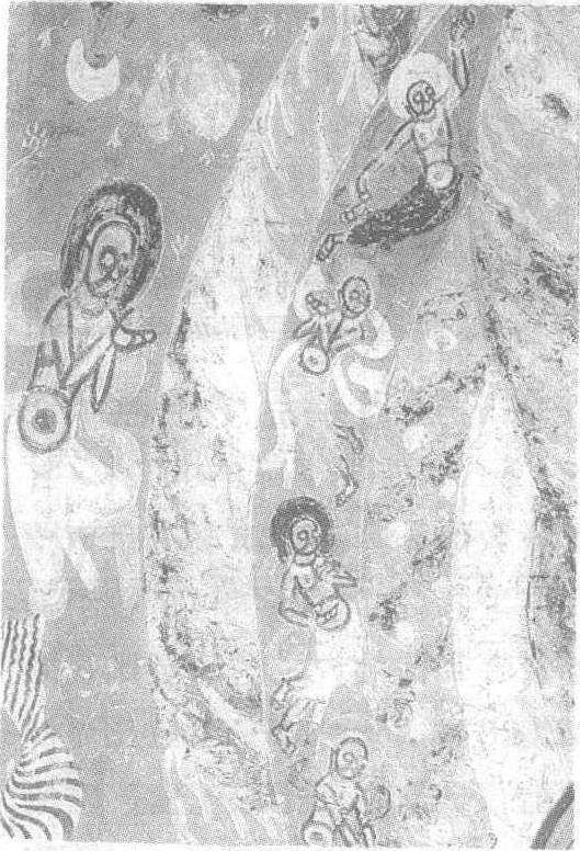 | 释义 | 飞天壁画 飞天壁画北凉。纵65厘米,横44厘米。甘肃省敦煌县莫高窟第272窟。此为绘于西壁主尊背光上的部分飞天。这组飞天面相丰满,上身裸露,健康而富有弹性感。披巾环绕,腰围长裙,姿态优美而动人。因绘于背光的弧形画面内,其升腾、飞翔之态尤具魅力,富有韵律感。飞天的形体以粗线条晕染,具有粗犷豪放的风格。