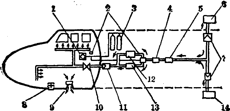 1. 氧气设备 2. 温度调节装置 3. 氧气源 4. 供气量调节装置 5. 空气滤 6. 压缩机 7. 单向活门 8. 安全活门 9. 压力调节装置 10 供气开关11. 单向活门 12. 加温装置 13. 冷却装置14. 压缩机