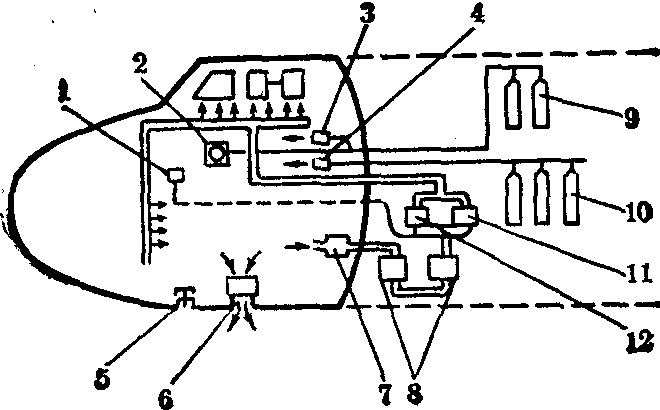1.温度调节装置 2.氧气设备 3.供氧调节器4.供气调节器 5.安全活门 6.压力调节装置7.通风器 8. 再生装置 9.氧气瓶 10.冷气瓶11. 加温装置 12. 冷却装置