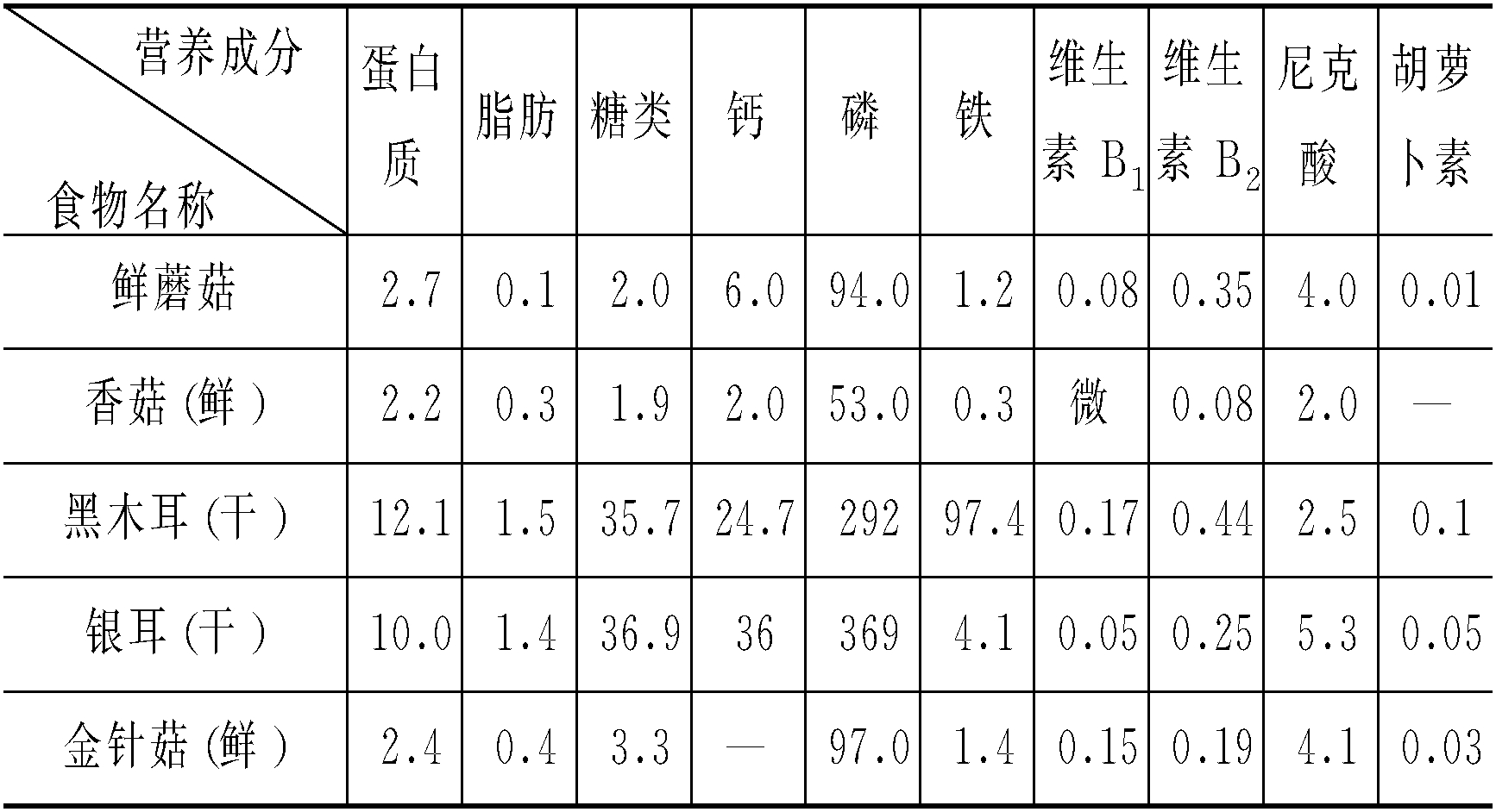 | 释义 | 食用真菌营养素含量食用真菌属高蛋白(占干重的24%~44%)、低脂肪(占干重的2%~8%)食品,营养素含量丰富。但干制品与鲜制品营养素含量相差大。如每100 g干蘑菇含蛋白质36.1 g、脂肪3.6 g、糖类31.2 g,钙131 mg、磷718 mg、铁188.5 mg;干制蘑菇每100 g含有蛋白质16.2 g、脂肪1.8 g、糖类60.2 g。几种常见食用菌营养素含量如下表(以100g计):