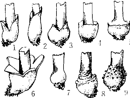 菌托类型 1.苞状 2.鞘状 3.鳞茎状 4.杯状 5.杵状 6.瓣状 7.菌托退化 8.带状 9.数圈颗粒状 |