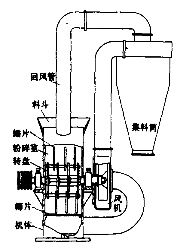 图2爪式粉碎机 爪式粉碎机 其结构如图2。由机壳、盛料斗、粉碎室和环形筛等组成。粉碎室由动齿盘和定齿盘组成。动齿盘上有3~4圈齿爪,定齿盘上有2~3圈齿爪,各圈齿爪交错排列。工作时,饲料原料由盛料斗通过进料控制闸板自动流入粉碎室的中央,受离心力和气流的作用,自内圈向外圈运动,在运动过程中,饲料受到动齿和定齿的多次冲击、搓擦而逐渐碎成细粉。同时由高速旋转的动齿盘形成的风压使细粉穿过环形筛孔排出,较大的颗粒仍留在筛圈内继续被粉碎,直到穿过筛孔为止。所配环形筛的孔径为0.5~3.5毫米,可根据饲料所要求的细度来加以选用。动齿盘外缘的旋转线速度为80~85米/秒。粉碎玉米的生产能力为45~55千克/千瓦小时。爪式粉碎机的特点是结构紧凑,粉碎粒度较细,适合于粉碎含纤维较少的精料。但耗能较多,齿爪易损坏和磨损,工作时的噪音较大。中国的爪式粉碎机已实现系列化,共有五种型号。 饲料粉碎机将饲料粉碎成细小颗粒的加工机械。常用的有锤片式、爪式和辊式3种。锤片式约占粉碎机总量的90%以上。锤式粉碎机要求饲料含水量不超过50%。农村用粉碎机线速度为60~80m/s。现有粉碎机噪声一般都超过85 dB。中国1998年拥有饲料粉碎机191.85万台。 |