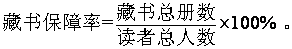| 释义 | 馆藏保障率 馆藏保障率是指图书馆提供本馆正式读者使用的藏书册数与图书馆拥有的读者人数的比率,实际上即指保障每个读者在图书馆平均有多少图书可用。其计算方法是: