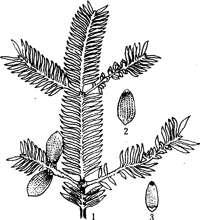 香 榧1. 果枝; 2. 果实; 3. 种子 性喜温暖湿润, 耐阴。年平均温16~17℃、年日照时数1800~2000小时,年降水量1500~1700毫米,海拔300~800米,土壤pH值5.5~6.0的沙质红黄壤生长最适宜。 主要品种 榧属植物在世界上主要栽培种仅香榧一种。香榧最主要的品种无性繁殖者仅枫桥香榧(细榧)1个, 此外, 尚有芝麻榧、米榧、茄榧、圆榧、蛋榧、獠牙榧、棱榧、丁香榧、水榧、寸金榧及两性榧等20余个品种类型。以浙江诸暨、嵊县、绍兴栽培的枫桥香榧产量最多, 品质也最优。除枫桥香榧供市场销售外, 会稽山区的芝麻榧、米榧、茄榧也供食用, 但品质稍差, 其余均供药用; 湖北竹溪的米榧及江西等省的少量圆榧, 亦多供药用。 栽培技术要点 植地宜选择空旷通风透光处。多以枝接或实生繁殖。采用鱼鳞坑或等高梯田栽植, 株行距5~7米,须配置1~2%雄株授粉。花前施氮磷钾速效肥为主, 以减少落花落果; 采果后要多施有机肥和适量速效氮, 以恢复树势和保护幼果越冬。树冠扩大以后, 要适当疏剪短截更新, 以克服大小年。缺少雄株处, 要人工授粉, 以提高着果率。于4月中旬喷磷酸二氢钾1 000~4 000ppm, 防止落果效果显著。种子开始转黄, 种皮部分开裂即可采收。采下种子堆积发酵, 待假种皮腐烂后, 洗净晒干贮藏。 经济价值 为中国特有干果。种子烘炒后, 香酥松脆, 风味奇特, 为馈赠款待亲朋的珍果。椒盐香榧深受国内市场欢迎。含油达51.7%, 可榨油供食用。木材富弹性, 不翘不裂, 是建筑、造船、家具及雕刻良材。树皮富含单宁、柠檬醛及芳樟脂, 为栲胶及高档芳香油重要原料。榧子有润肺、化痰、止咳、顺气、消积、消痔、通便及驱除蛲虫、钩虫、蛔虫等功效。树姿雄伟挺拔, 四季常青, 为庭园绿化良种。在华东、华中等区域的红黄壤山区大可发展。 香榧Chinese torreyaTorreya grandis Fort.,紫杉科,榧属。常绿乔木。原产中国东南部。栽培地区集中在浙江省的会稽山、天目山、安徽的黄山等地。高15~25 m,小枝黄绿色。叶线形,先端刺尖,基部圆形,叶面深绿光亮,叶背有两条黄白色气孔带。雌雄异株,花单生,腋生;雄花药囊顶端截形;雌花无柄,由数枚苞片和一个直立裸露胚珠组成。种子倒卵形或椭圆形,长2.4~4 cm,熟时紫色,胚乳微皱,可食部分为胚乳。4~5月开白花,次年秋季果实成熟。2n=22。性喜温暖、湿润、凉爽、多雾、半阴的高山区。树寿命长。实生或嫁接繁殖。种仁主要用于炒食,也可加工糖食。榧油是优质食用油。