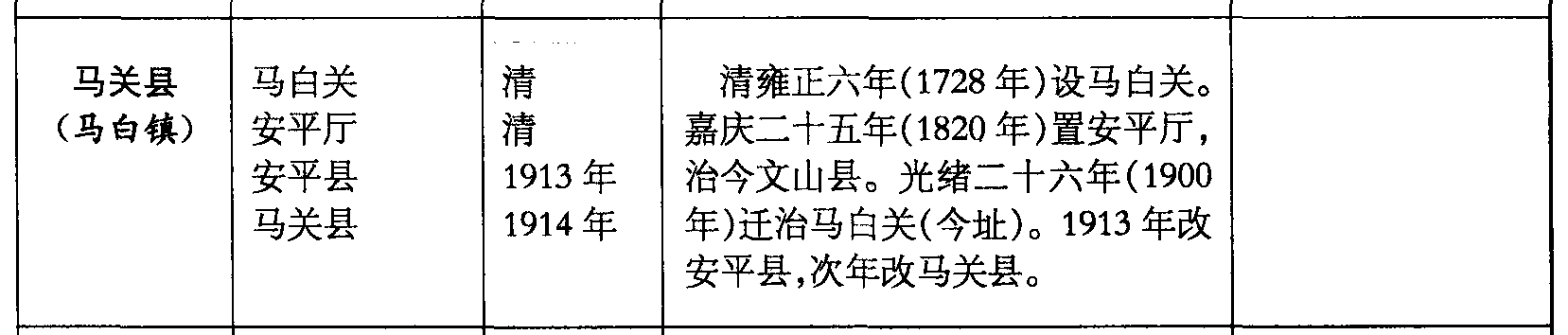 马关县(马白镇)马白关安平厅安平县马关县清清1913年1914年清雍正六年(1728年)设马白关。嘉庆二十五年(1820年)置安平厅,治今文山县。光绪二十六年(1900年)迁治马白关(今址)。1913年改安平县,次年改马关县。