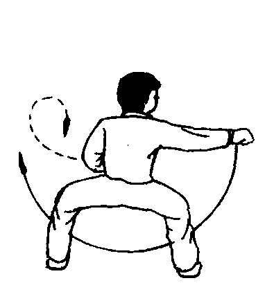 第一套少年拳动作之四。为马步与横打同时完成的拳术动作。教学重点 强调: ❶右脚向前落步的同时向左拧腰打右拳。❷落步转成马步要以脚掌为轴,边落边转。