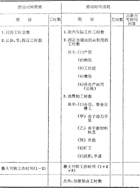 平衡表左方最大可能工作时间即制度工时总数,按工作班数及每班工作时间计算,如果各类工人制度工作日长度不同,应分别计算汇总。 平衡表右方劳动时间消耗,可根据具体要求作不同的分组,以利分析研究。 |