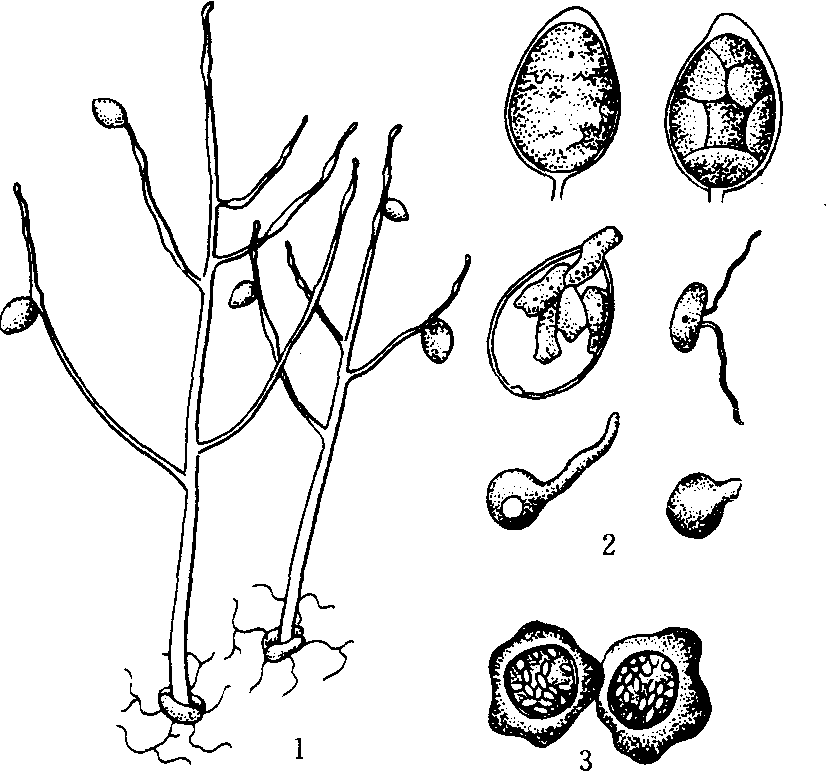 侵染过程和病害循环 病菌以休止孢子萌发的芽管从气孔或表皮侵入,在寄主细胞间隙中发展成菌丝,以吸器伸进细胞内吸取养分。致病疫霉除卵孢子外不能在土壤或病残组织中长期存活和耐严冬的低温,但有形成厚垣孢子存活3个月的报道。在一年一作地区冬季漫长,晚疫病的初侵染源为发病而不严重的薯块,收藏入窖而越冬。来年的和健薯一起播种到地里,病菌随温度转暖而活动,沿着幼苗的茎秆长到地面。气候温暖潮湿在地上或地下的病斑上长出孢子囊侵染叶片与邻近的健苗,经过几次再侵染形成一定数量的病株病叶后成为发病中心才被发现。此时若气候继续潮湿,短期内全田发病。西南地区由于冬季较温暖和有马铃薯植株存在,且多雨潮湿,加上有垂直分布的多种种植制,晚疫病能在早期发生,侵染源不限于本田的病薯。晚疫病的流行主要由温湿度是否适宜与持续时间的长短及品种的抗病性而定。据1951~1961年11年中国张家口地区的资料统计,发病严重的6年中,6、7、8三个月的降雨在200毫米以上,而且连续三年旬相对湿度达到75%以上,高湿旬次数愈多,病害愈严重。病菌传播距离主要在初侵染源附近,但不排除少数能传到几公里以外。 病害控制 马铃薯晚疫病的防治应采取以农业防治、加强栽培管理和药剂保护相结合的措施,主要有三方面。❶选用抗病品种。中国已育出上百个抗病品种,大大减轻了晚疫病的威胁。 ❷减少菌源。首先要从无病留种开始。留种田除严格进行化学保护外,还应增高培土,注意排水,防止病菌随雨水渗入土中侵染新薯。提倡割蔓晒地两个星期后收获,在入窖、播种前淘汰并处理好病薯。 ❸化学保护。根据气象条件和发病中心的出现进行晚疫病流行的预测预报,及时对发病中心附近及低洼地进行化学防治,逐步扩大范围。喷药次数因药剂种类和气象条件而定。药剂种类有波尔多液、代森锌、代森铵等保护剂和内吸杀菌剂瑞毒霉等。 马铃薯晚疫病potato late blight马铃薯的一种重要真菌病害。广泛分布于世界主要马铃薯产区。病原菌是鞭毛菌亚门的致病疫霉菌〔Phytophthora in-festans(Mont.)de Bary〕。危害叶、茎和块茎。病叶初现水渍状小斑,后扩大为褐色病斑,田间湿度大时变成黑色湿腐,病斑和健康部分的界限不明显,周围黄绿色,叶背病斑产生白色霉层(孢囊梗及孢子囊)。有时病斑扩展到叶柄和茎秆上。病薯表面出现褐色或紫褐色凹陷病斑。土壤潮湿时病斑可深入内部,干燥时表面病斑变硬。病菌也侵害番茄的叶和果实。病菌寄生专化性强,可划分成许多生理小种。病菌主要以菌丝体在病薯内越冬。病薯播种后可在田间形成中心病株,产生孢子囊借气流和水流传播并不断再侵染。潮湿、凉爽、多雾、多露或阴雨天气有利于病害蔓延。品种间抗病性差异明显。可采取选用抗病品种、种植无病种薯和喷洒菌剂等防治措施。
